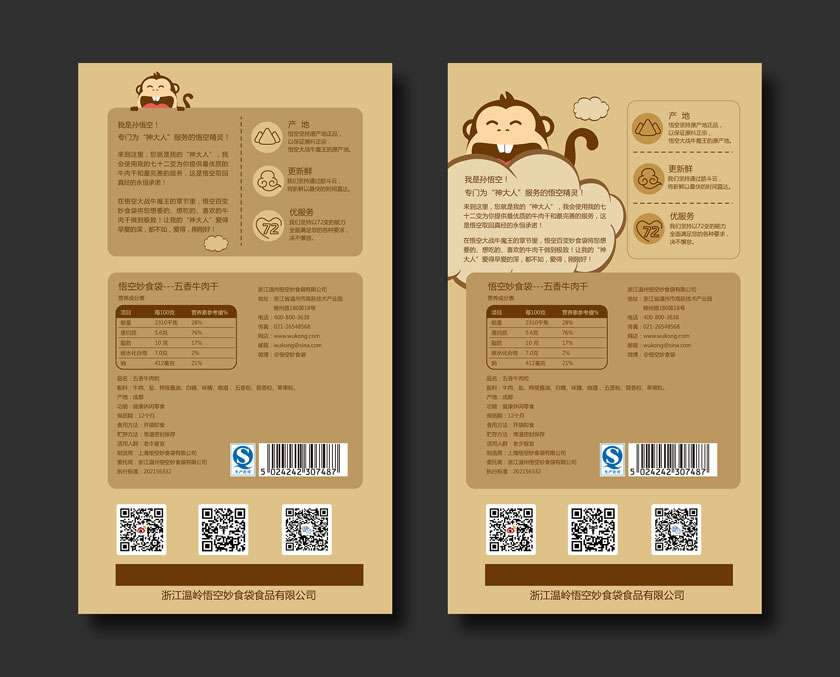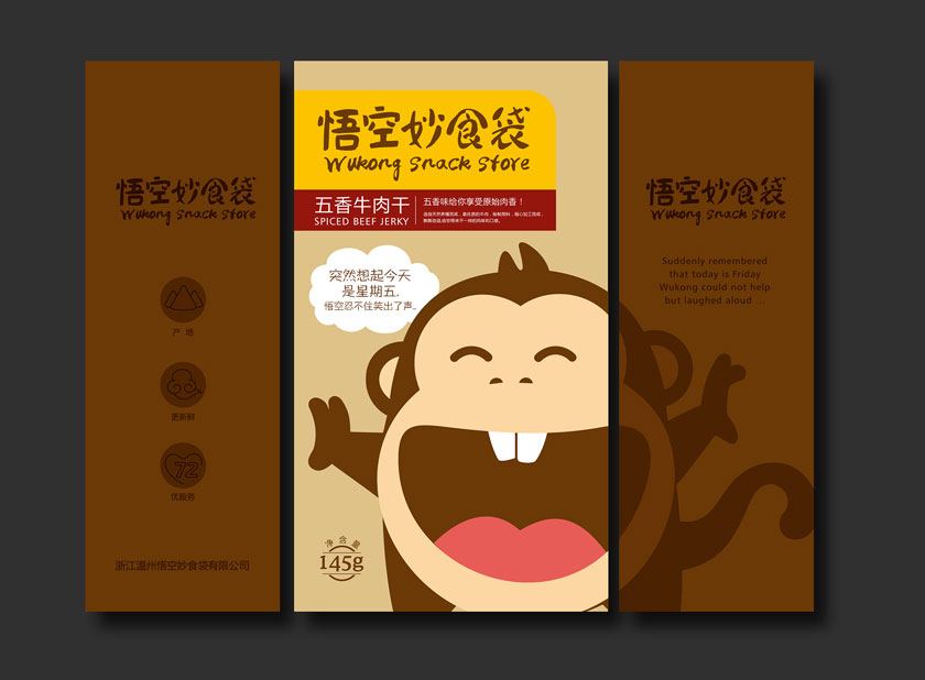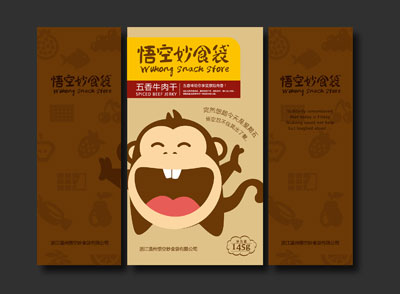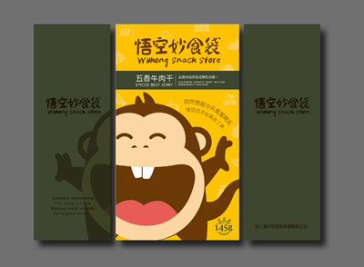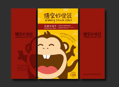 悟空妙食袋作为初创品牌,致力于做正宗原产地的休闲零食,其中代表产品就是牛肉干。我们在调研、分析了休闲零食市场的消费现状后,为悟空妙食袋设计了一组妙趣横生的产品包装袋。