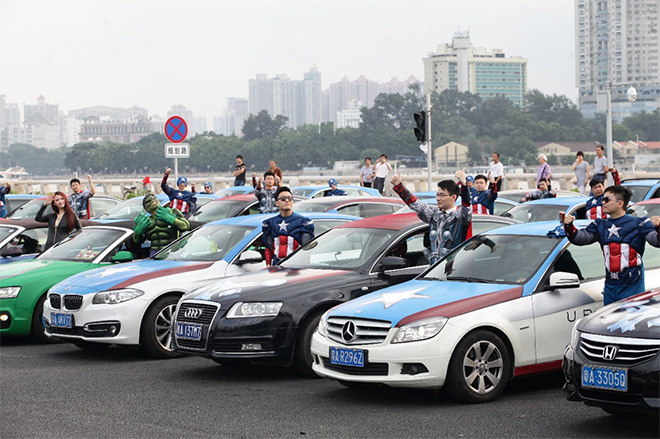 这是UBER与曜能量推出的活动,在《复仇者联盟》上映前,曜能量联手UBER一起策划的英雄专车活动,活动期间打开UBER有英雄专车入口,地图上的车也身披斗篷,威风得很!“热点事件(电影《复仇者联盟》上映)+人物cosplay+线下场景引爆”让这个事件的关注度再次提升!