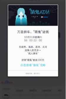 是一家互联网金融公司PPmoney与UBER联合推出的活动,在万圣节当天下午4点,Uber的App上开启一键呼叫“鬼”送钱按钮,当天乘客参与活动就有可能遇到“鬼”司机或者“鬼妹妹”,不过这些乘客却不会吓到,反而很兴奋,因为他们都会收到了PPmoney送出6万~30万的“鬼混金”(价值人民币100元~500元)。