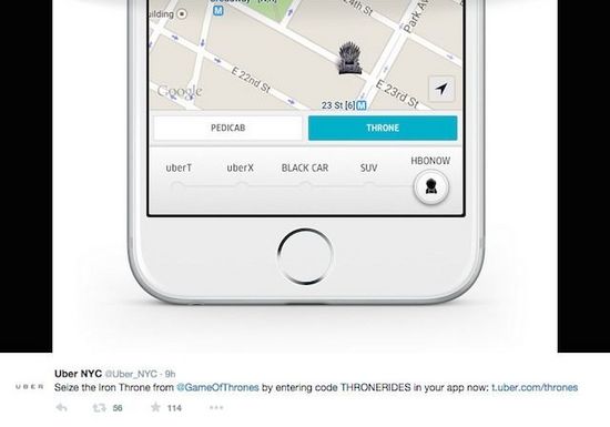 2015年4月16-17日的中午11点至下午5点,HBO联合UBER,在美国曼哈顿的14街到59街、莱辛顿大道到第九大道之间的区域推出“铁王座”试乘服务。